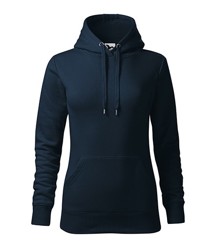 A kék kapucnis női pulóver anyaga 65% pamutból és 35% poliészterből készült, 320 g/m2 súlyú. A pulóver belső része bolyhos, külső felülete nyomásra és hímzésre is alkalmas.