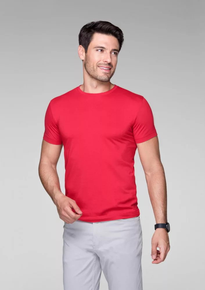 Kiváló minőségű termékünk ez a férfi, karcsúsított szabású piros rövid ujjú póló single jersey anyagból.