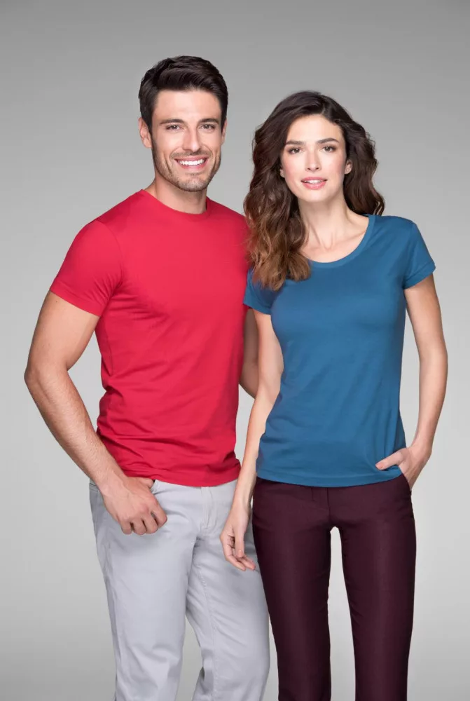 A piros póló anyaga 100% pamutból (SUPIMA®) készült, single jersey, 160 g/m2 súlyú.