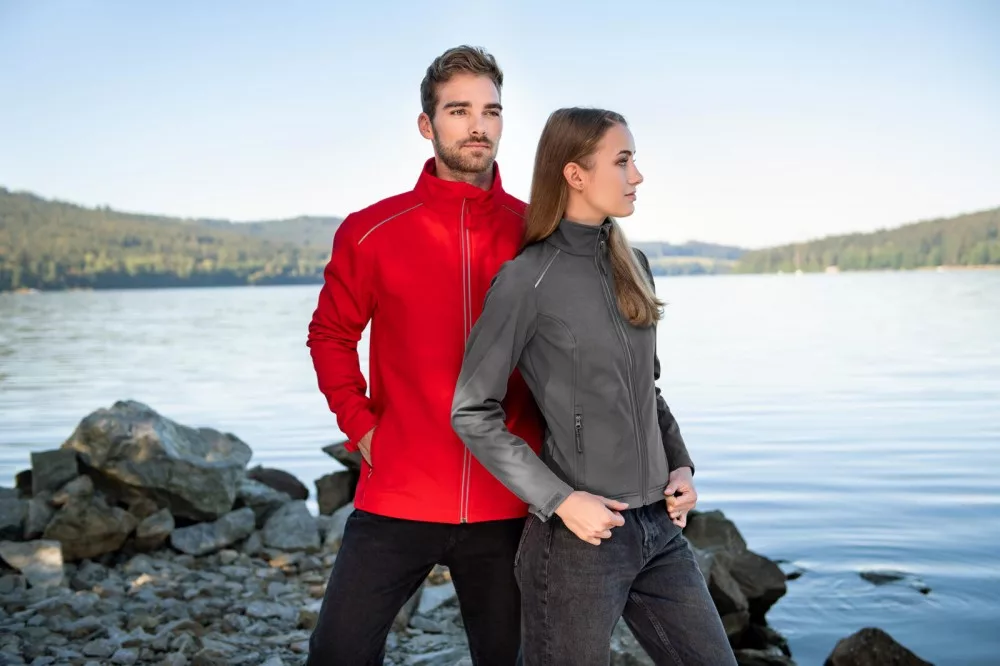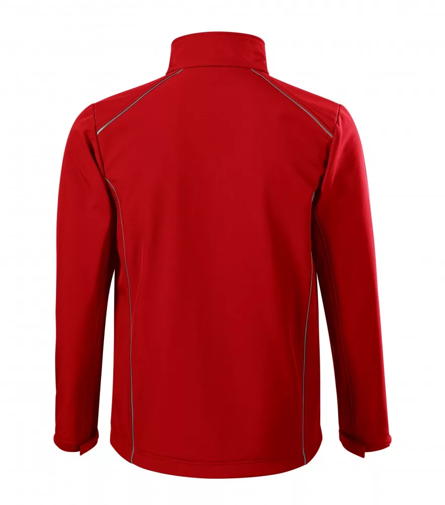 Klasszikus szabású, kiváló minőségű, légáterszető, három rétegű piros softshell kabát ívelt, hosszabbított hátrésszel és fényvisszaverő elemekkel
