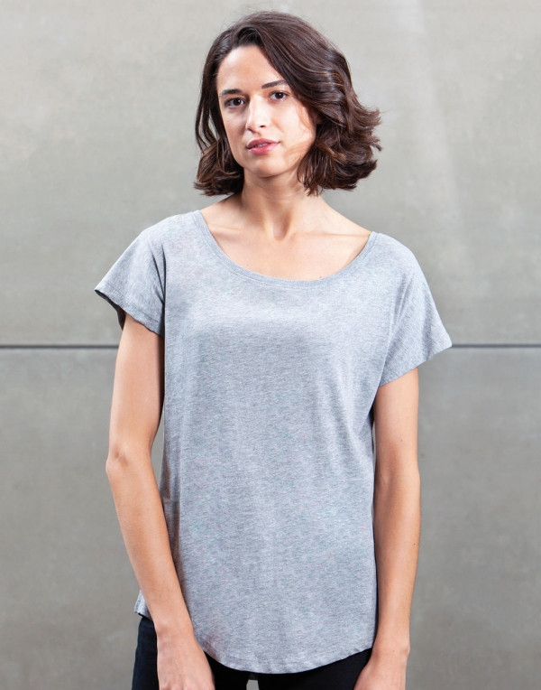 Kiváló minőségű, bővebb fazonú szürke női póló mélyebb nyakkivágással és kerekített aljjal.