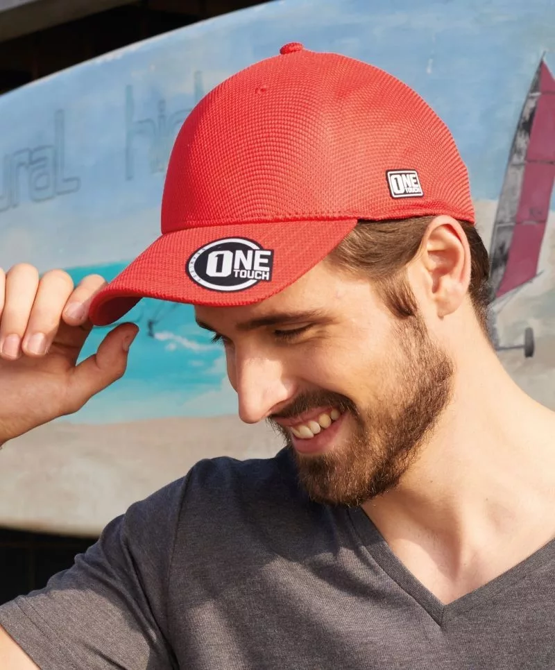 A piros sapka anyaga 100% poliészterből készült. A lélegző 3D hálós szövetnek és a poliészternek köszönhetően kiváló nedvességelvezető.