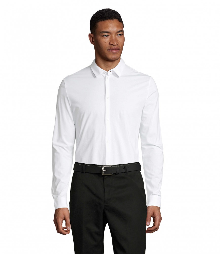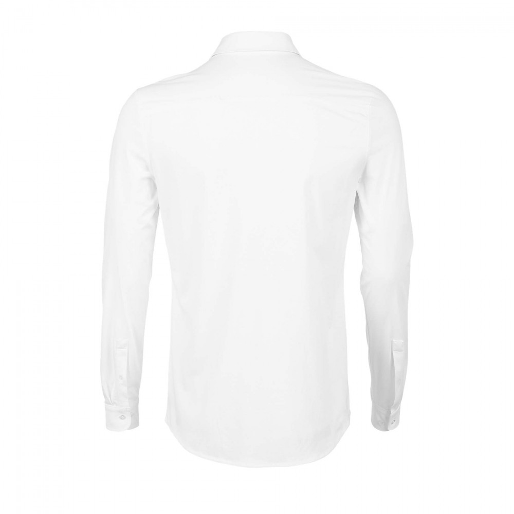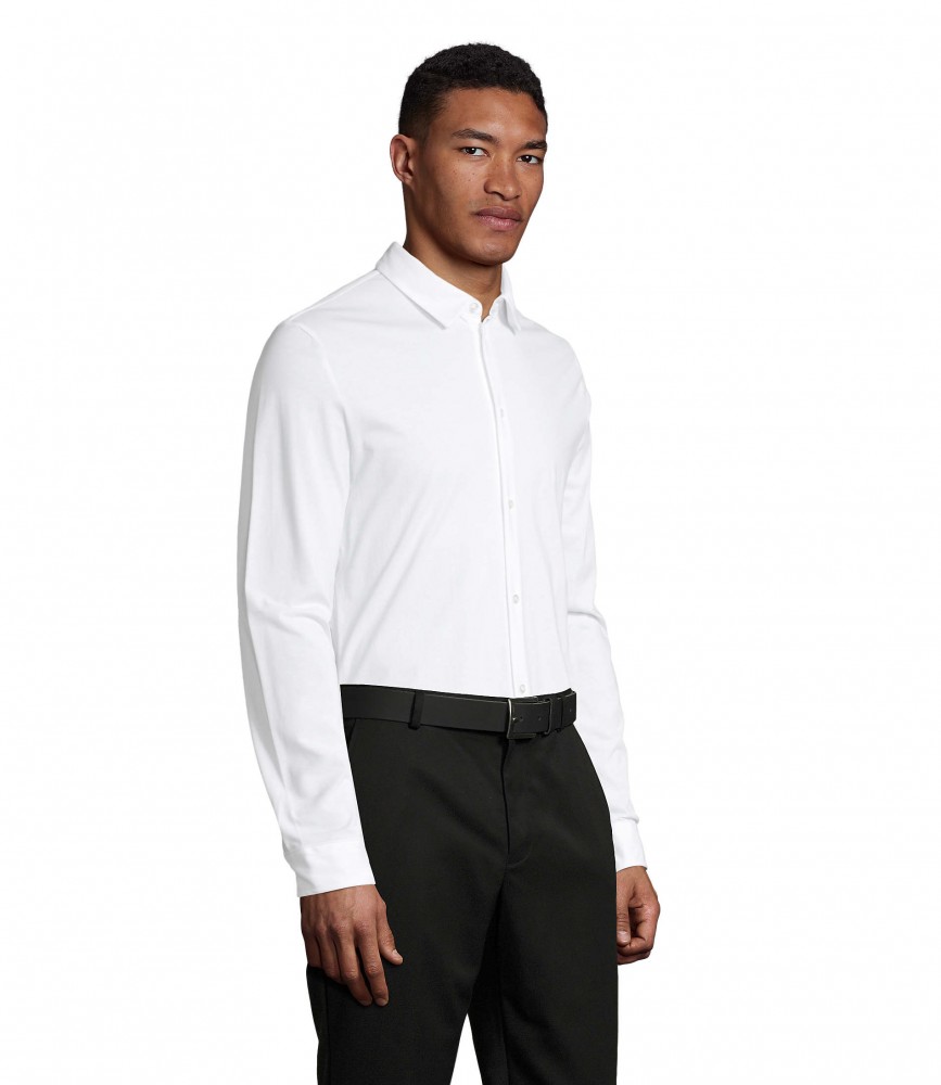 Testhezálló szabású, prémium minőségű, fehér hosszú ujjú ing mercelizált pamut anyagból, kerekített aljjal, megerősített gallérral és színazonos gombokkal