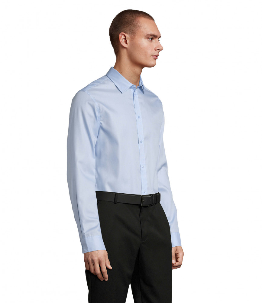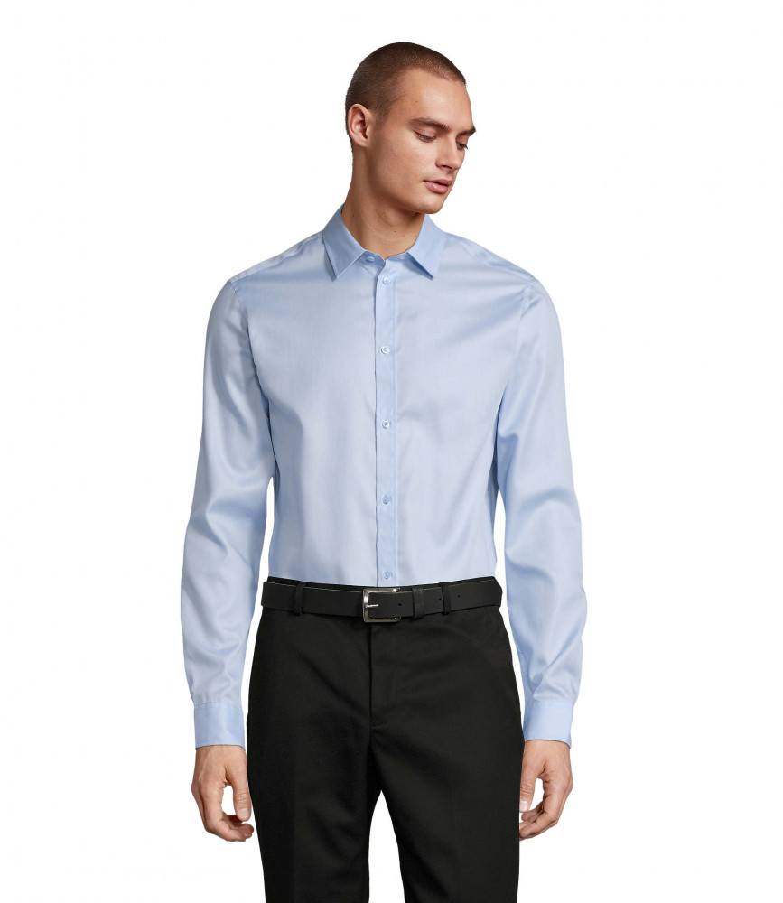 Modern szabású, klasszikus fazonú, kiváló minőségű, kék hosszú ujjú ing vasalásmentes pamut anyagból, kerekített aljjal, megerősített gallérral és színazonos gombokkal