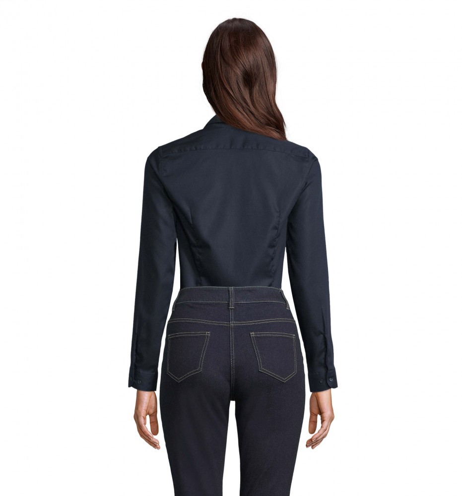 A nyújtott végű, valamint a kerekített alj elegánsabb megjelenést kölcsönöz a NeoBlu női ingnek.