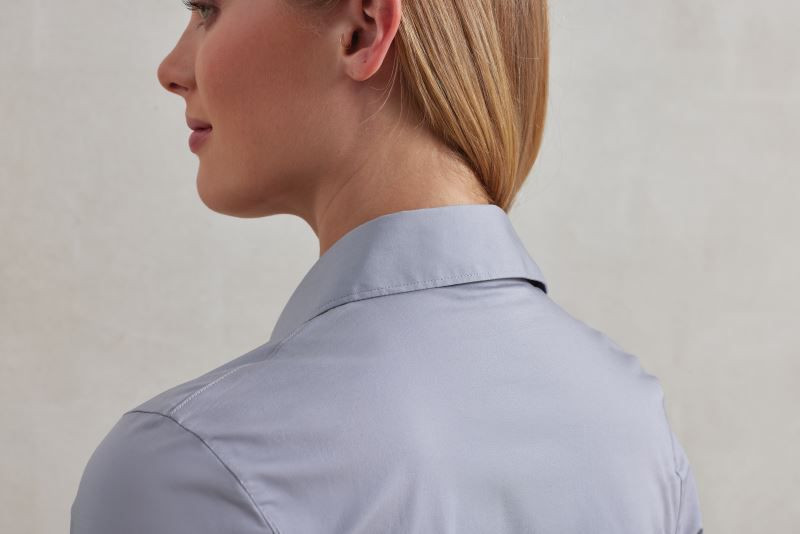 Az ezüst női blúz anyaga 97% pamutból és 3% elasztánból készült, 115 g/m2 súlyú.