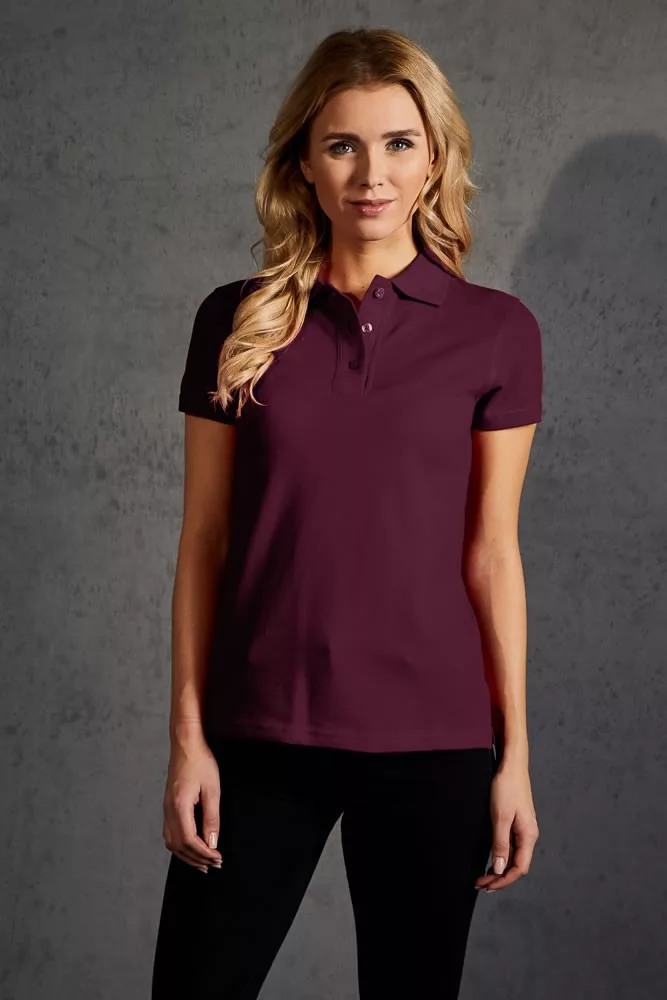 Karcsúsított szabású, kiváló minőségű bordó galléros női póló, oldalhasítékkal és keményített gallérral.
