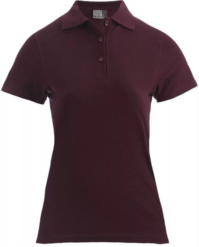 Kiváló minőségű termékünk ez a karcsúsított szabású bordó galléros női póló, oldalhasítékkal és keményített gallérral.