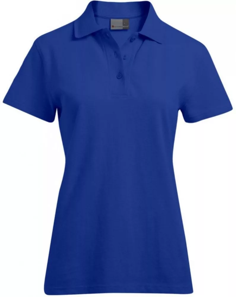 Karcsúsított szabású, kiváló minőségű kék galléros női póló, oldalhasítékkal és keményített gallérral.