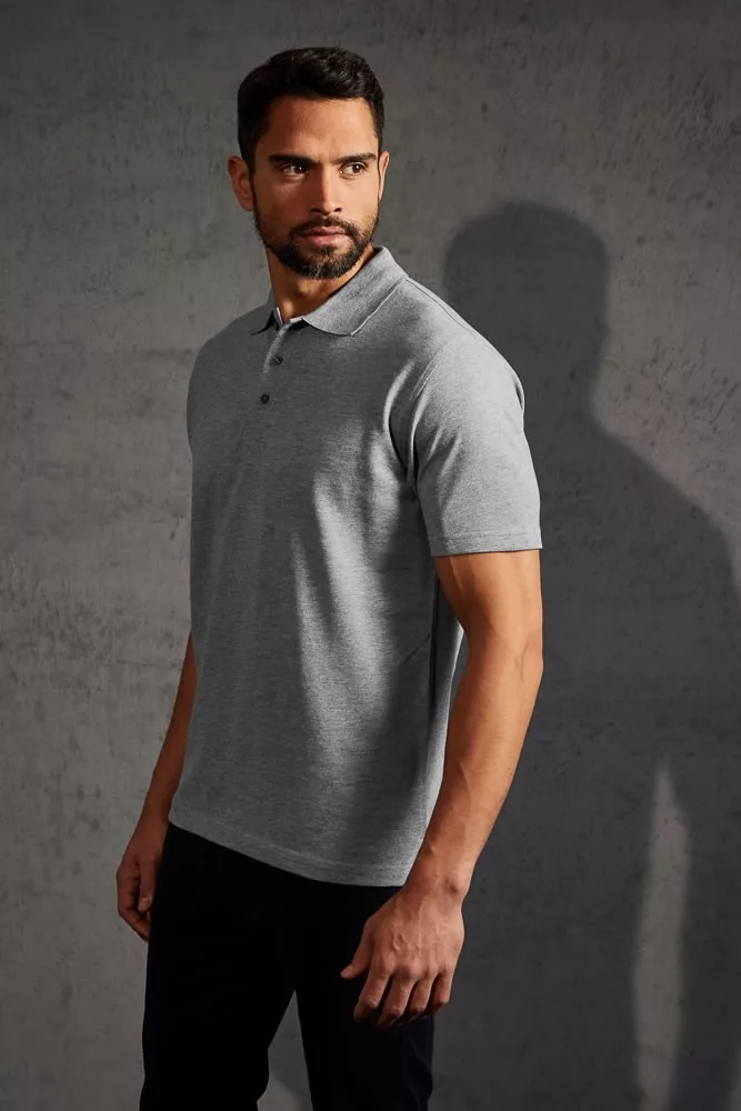 Testhezálló szabású, kiváló minőségű szürke galléros póló, oldalhasítékkal és keményített gallérral.