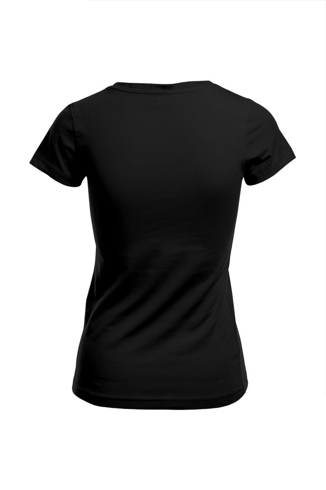 Kiváló minőségű termékünk ez a karcsúsított szabású fekete rövid ujjú női póló, V-nyakkivágással.