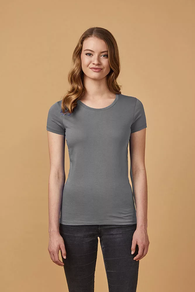 Karcsúsított szabású, kiváló minőségű szürke rövid ujjú női póló, kerek nyakkivágással.