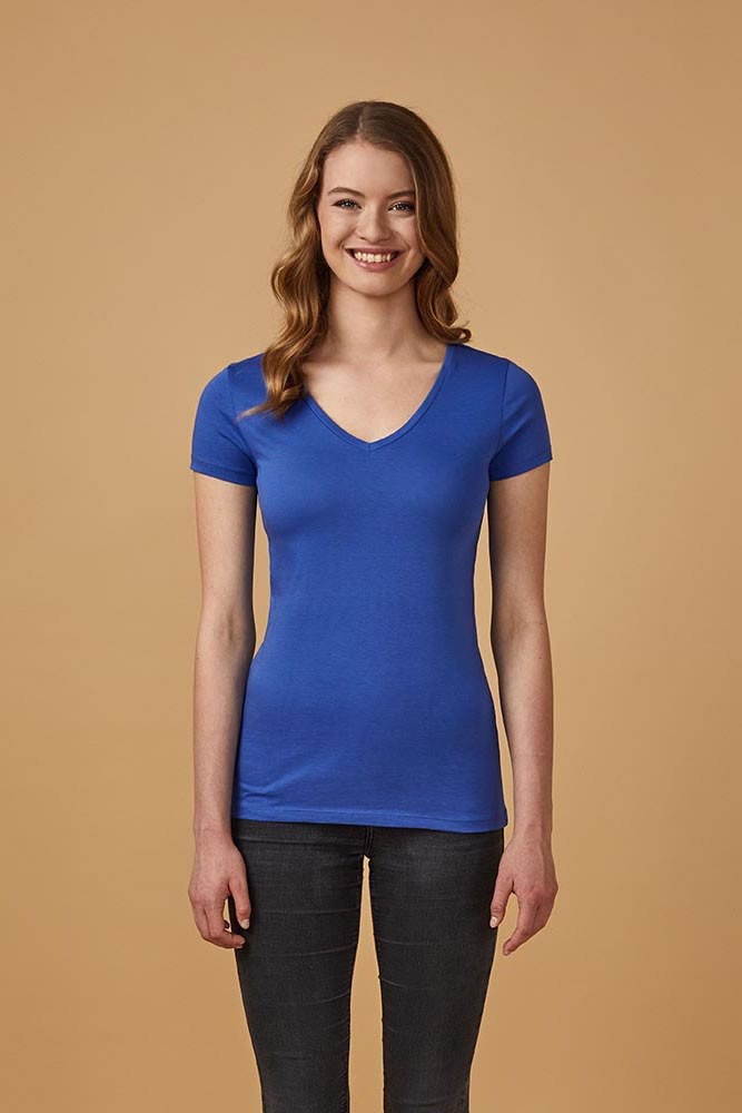 Karcsúsított szabású, kiváló minőségű kék rövid ujjú női póló, V-nyakkivágással.