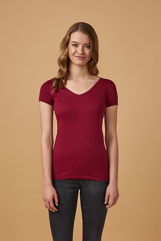 Karcsúsított szabású, kiváló minőségű bordó rövid ujjú női póló, V-nyakkivágással.
