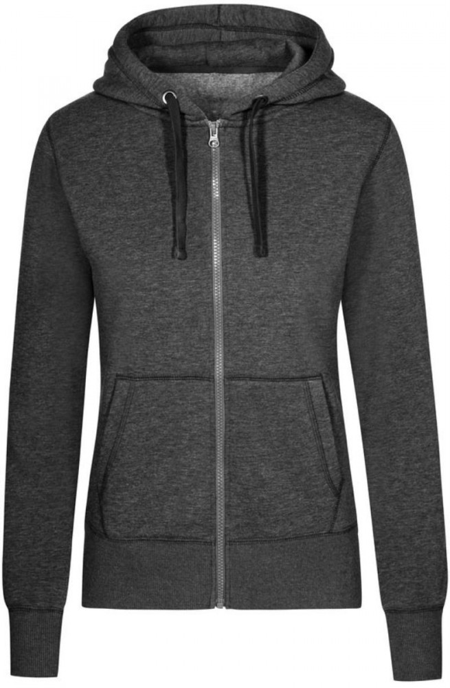 A fekete kapucnis, cipzáros női pulóver kenguru zsebekkel, valamint bordás kötésű ujjakkal és -derékrésszel készült. A kapucnit húzózsinórral látták el.