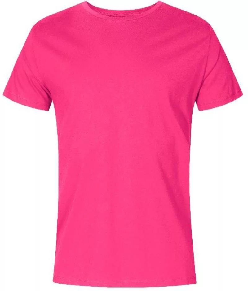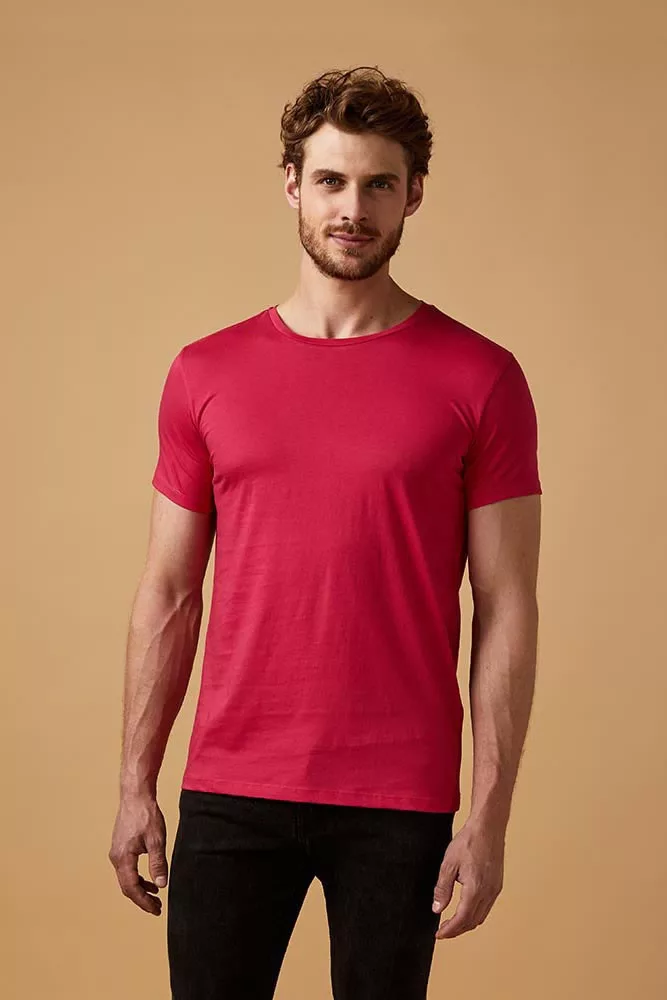 Testhezálló szabású, kiváló minőségű rózsaszín rövid ujjú póló, kerek nyakkivágással.