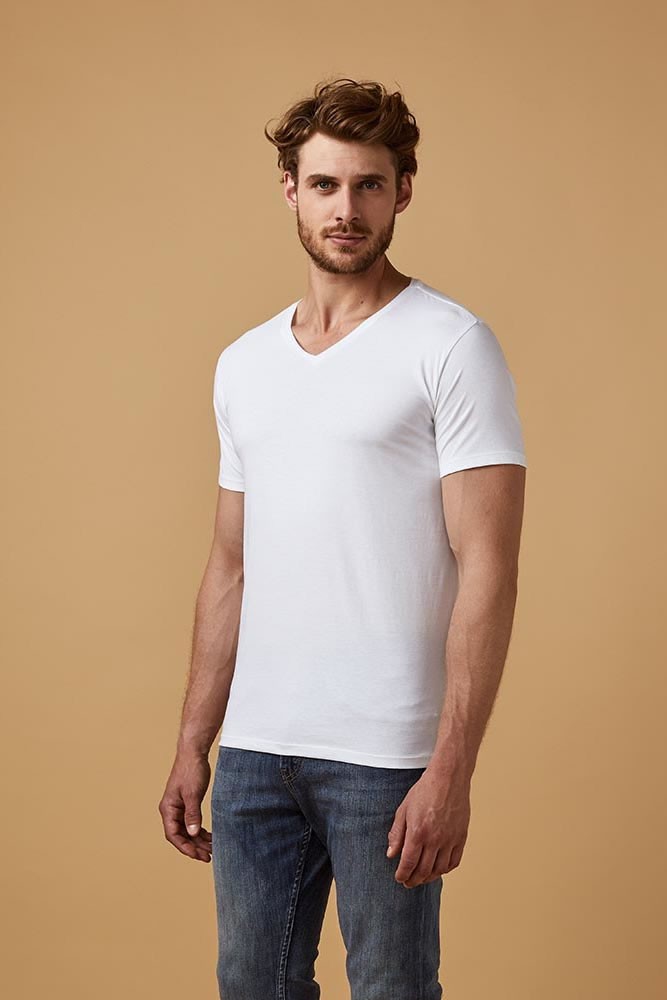 Testhezálló szabású, kiváló minőségű fehér rövid ujjú póló, V-nyakkivágással.