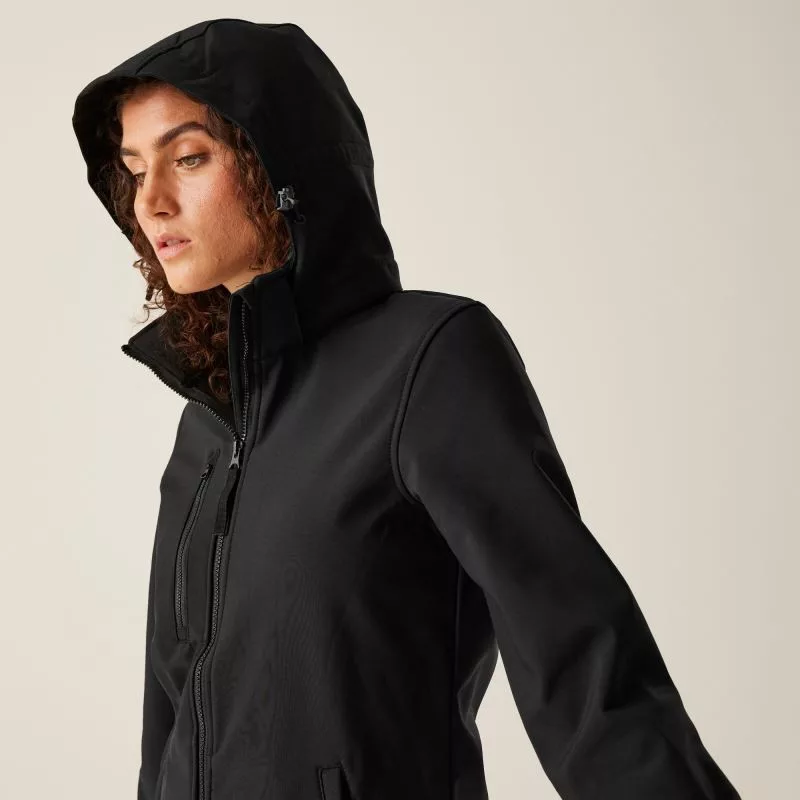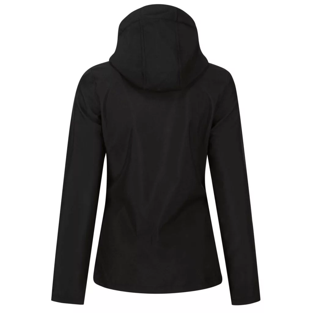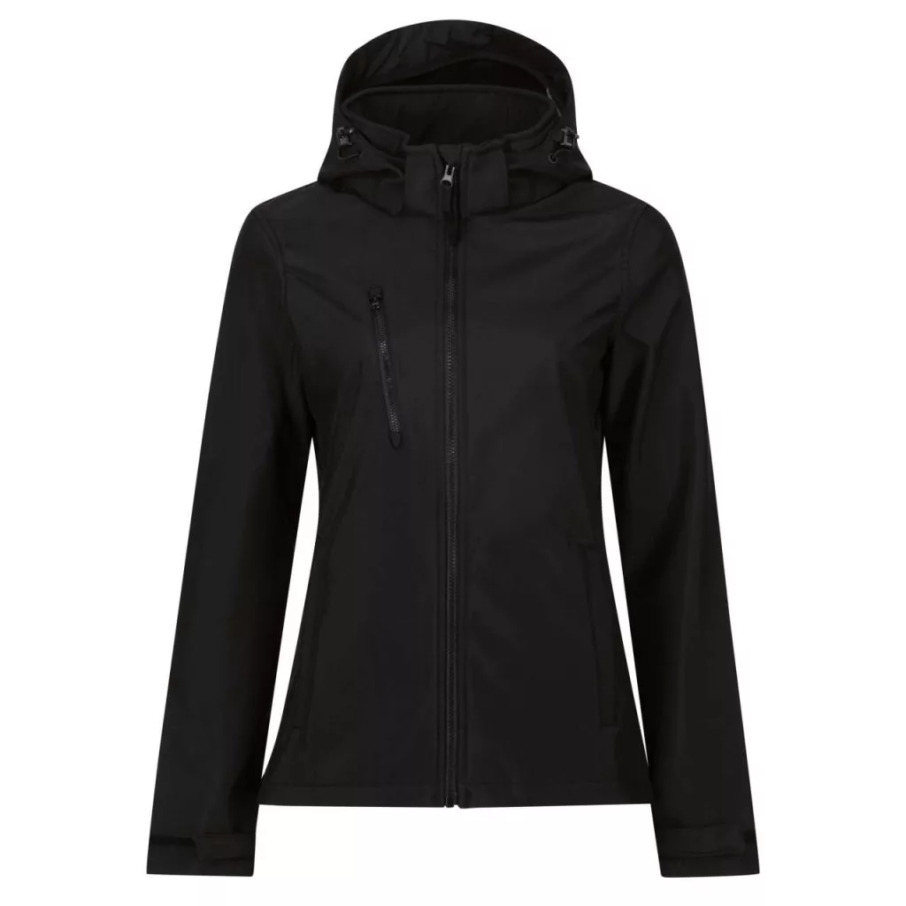 Karcsúsított szabású Regatta TRA702 Venturer női dzsekiállítható levehető softshell kapucnival, állítható ujjvégekkel, cipzáras oldal- és 1 cipzáras mellzsebbel, részben újrahasznosított poliészter XPT 3-régetű softshell szövetből, légáteresztő, szél- és vízálló membránnal, valamint polár belsővel!