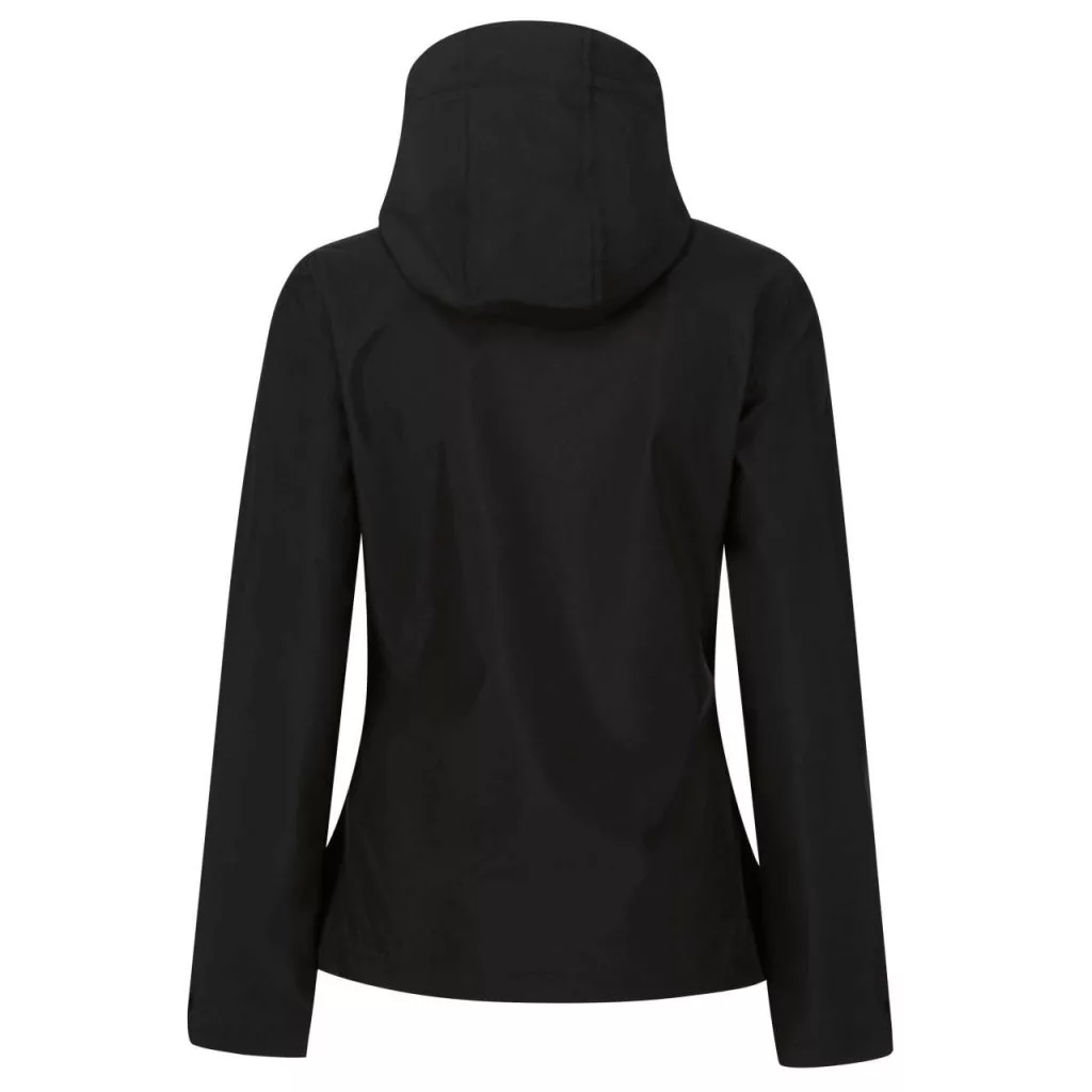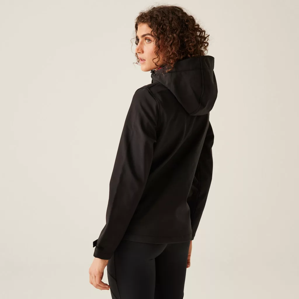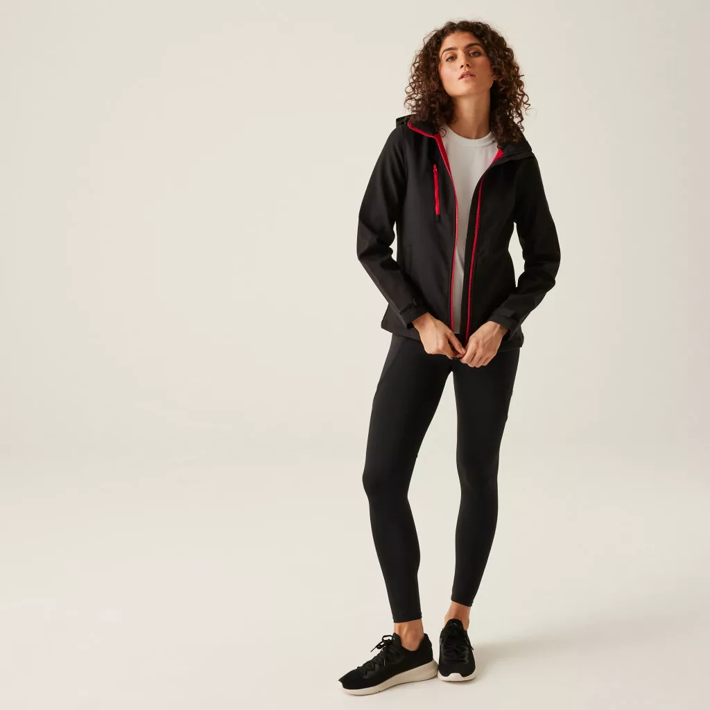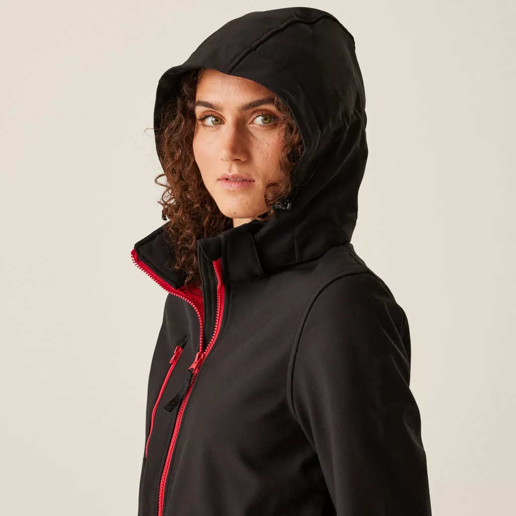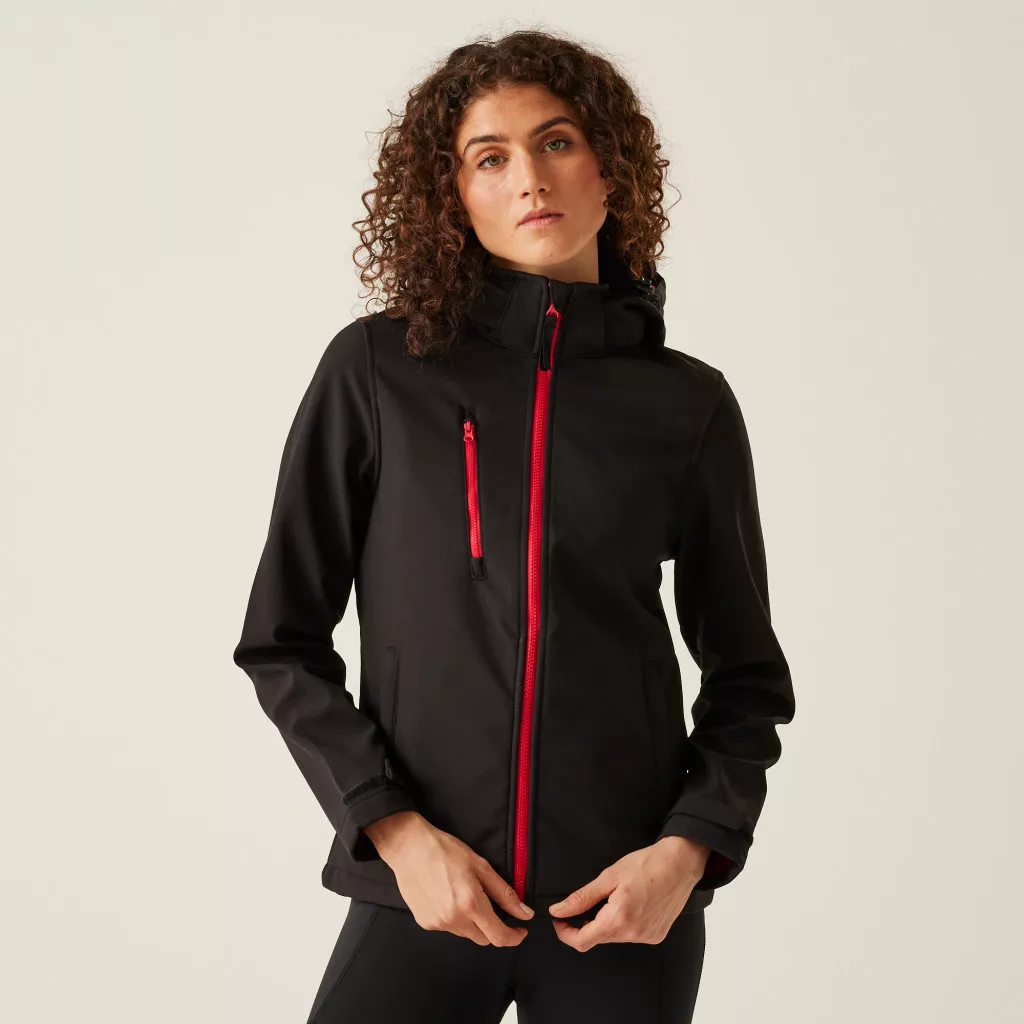 Karcsúsított szabású Regatta TRA702 Venturer női dzsekiállítható levehető softshell kapucnival, állítható ujjvégekkel, cipzáras oldal- és 1 cipzáras mellzsebbel, részben újrahasznosított poliészter XPT 3-régetű softshell szövetből, légáteresztő, szél- és vízálló membránnal, valamint polár belsővel!
