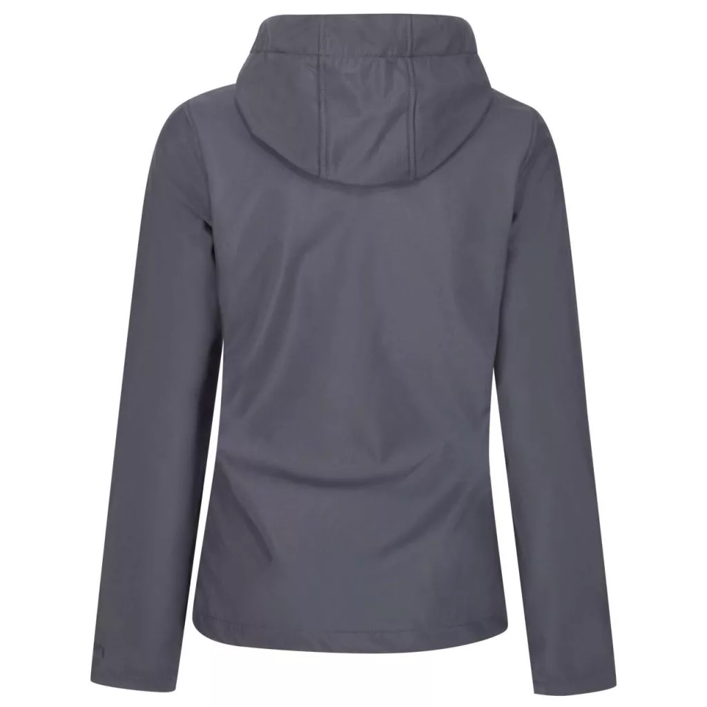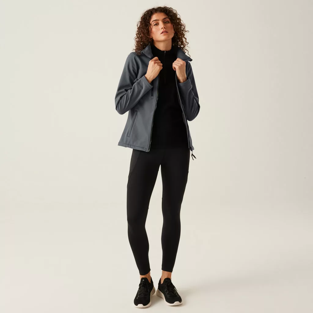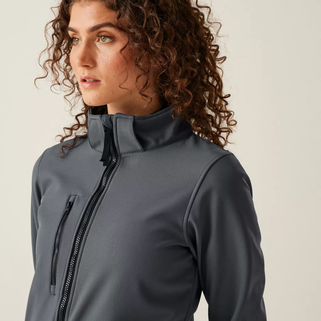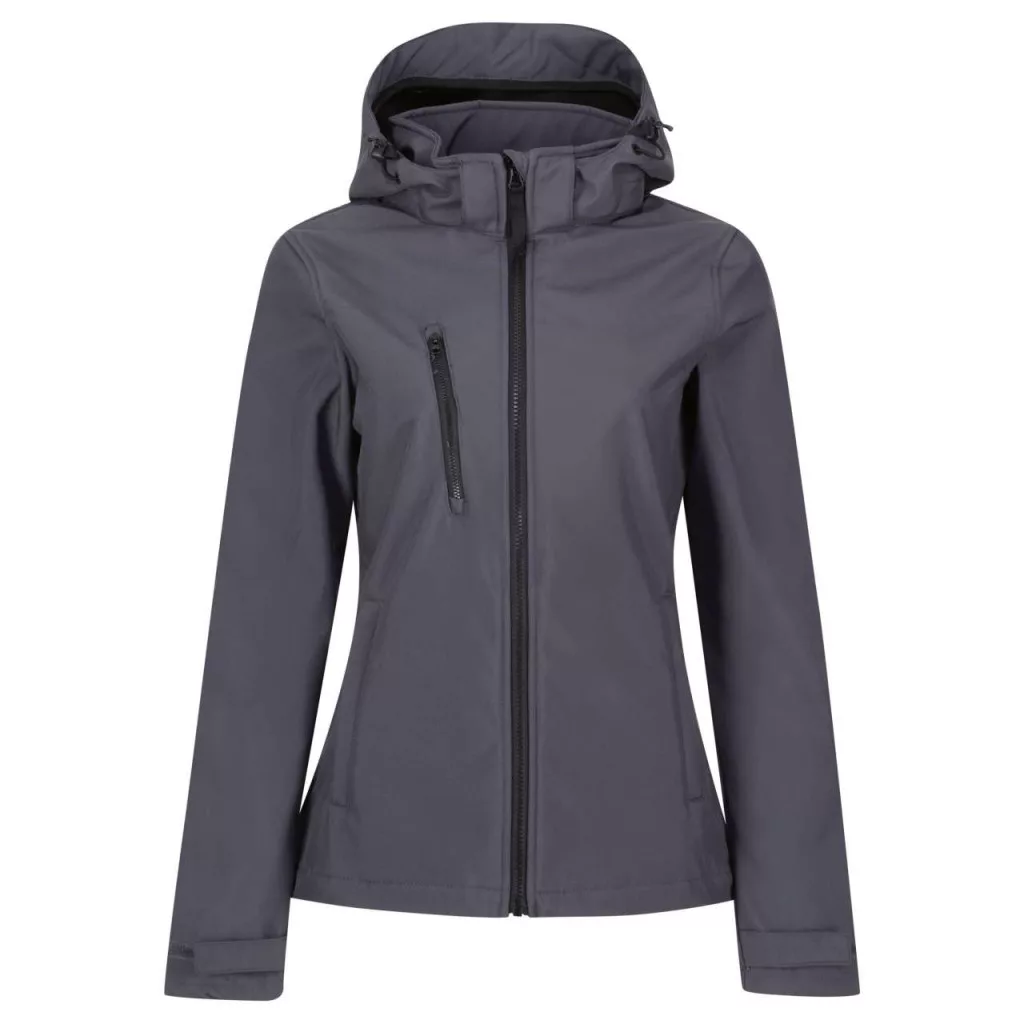 Karcsúsított szabású Regatta TRA702 Venturer női dzsekiállítható levehető softshell kapucnival, állítható ujjvégekkel, cipzáras oldal- és 1 cipzáras mellzsebbel, részben újrahasznosított poliészter XPT 3-régetű softshell szövetből, légáteresztő, szél- és vízálló membránnal, valamint polár belsővel!