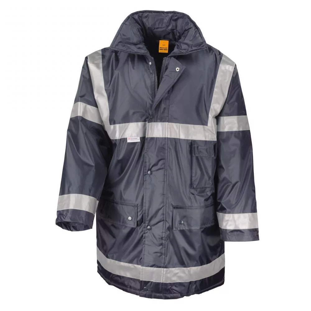 A kék bélelt kabáton elhelyezett fényvisszaverő csíkok elöl és hátul a sötétben jól láthatóvá teszik a viselőjét!