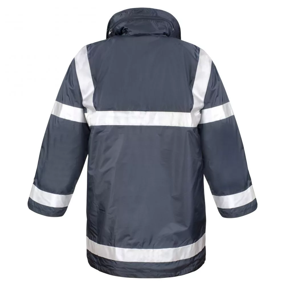 Kiváló minőségű, szél- és vízálló, kék jól láthatósági kabát gallérba beépített kapucnival és fényvisszaverő csíkokkal