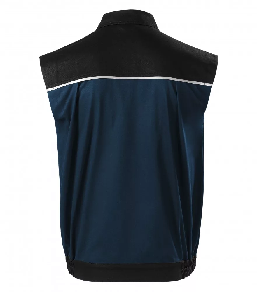 Pamut, kopásálló anyagból készült, kéttónusú munkás mellény, akasztófülekkel, multifunkciós zsebekkel, fényvisszaverő csíkokkal és a hátrész kettős szabással a könnyebb mozgásért