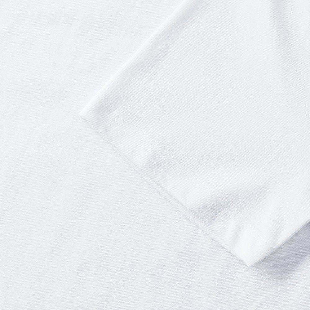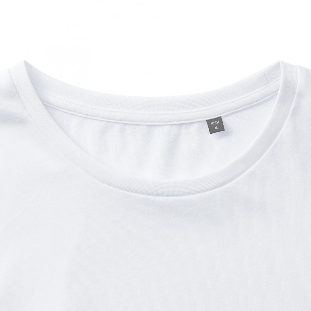 A fehér póló anyaga 100% pamutból (fésült, gyűrűsfonású, organikus, szimpla jersey) készült, 160 g/m2 súlyú.