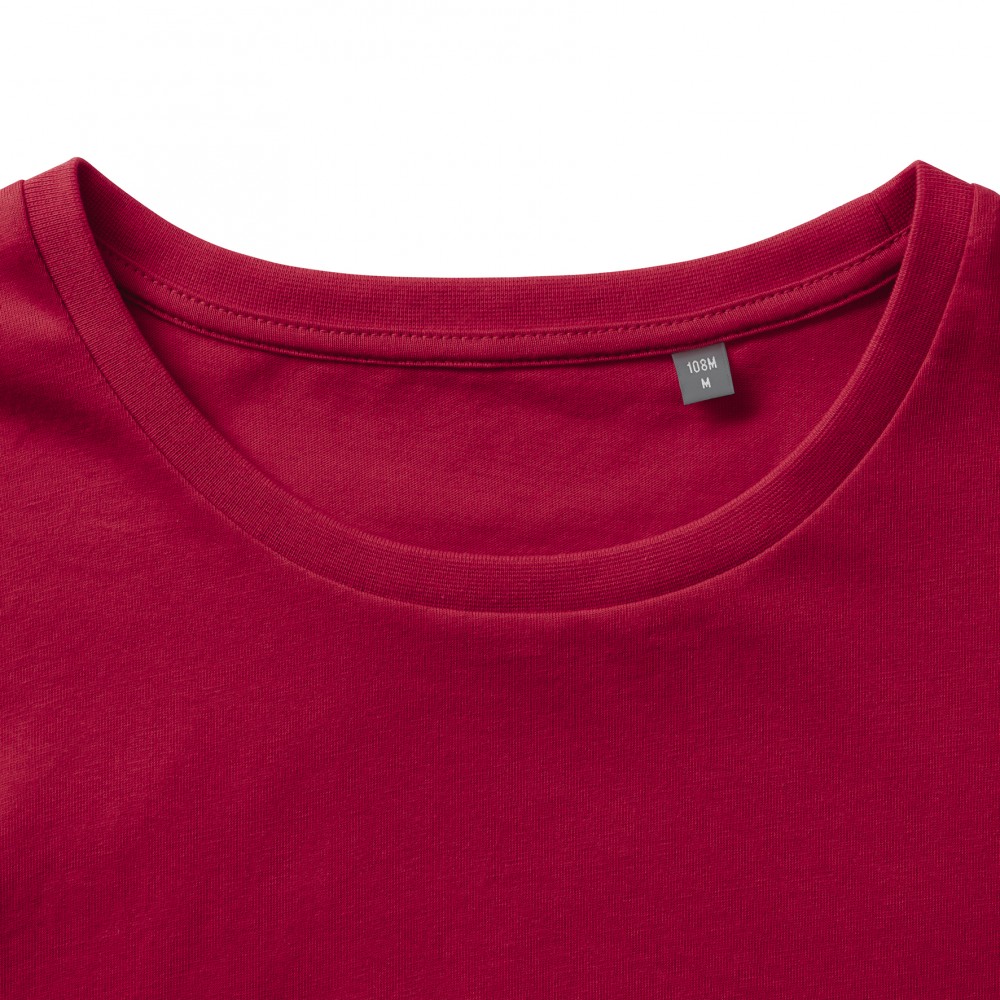 A piros póló anyaga 100% pamutból (fésült, gyűrűsfonású, organikus, szimpla jersey) készült, 160 g/m2 súlyú.