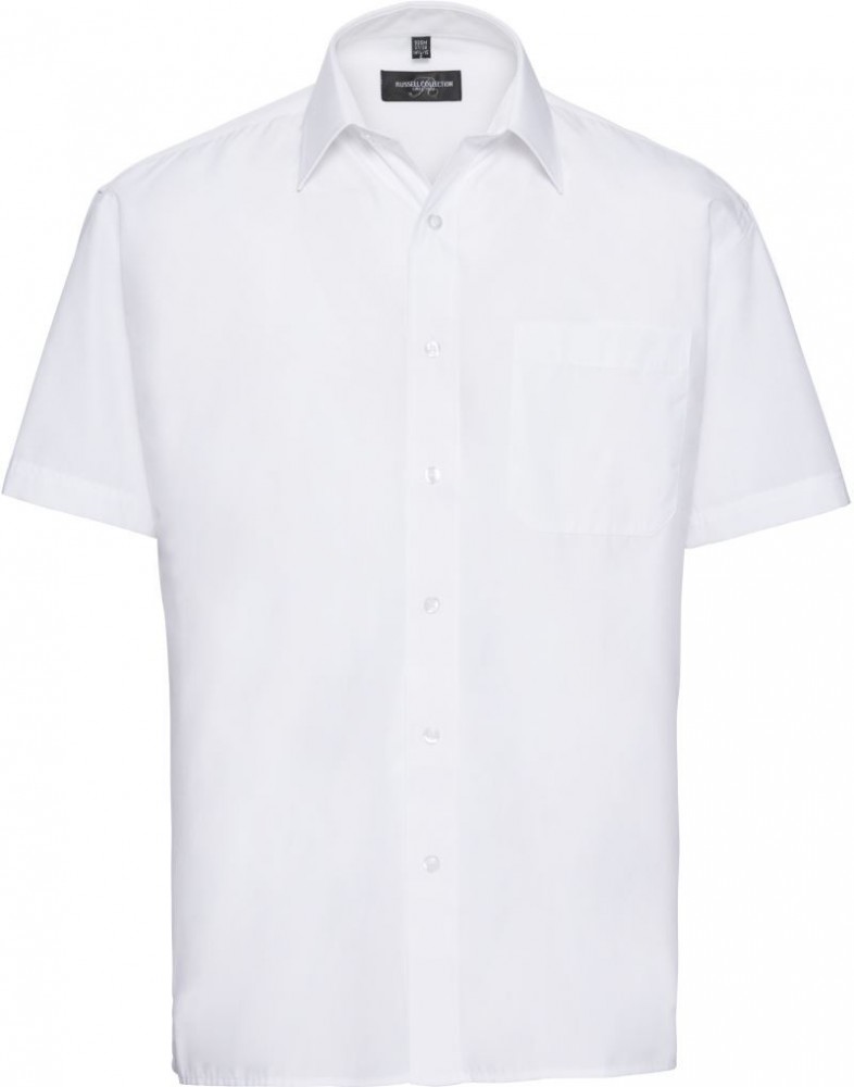 Klasszikus szabású, könnyen vasalható, kiváló minőségű, fehér rövid ujjú ing kevertszálas anyagból kerekített aljjal, merevített gallérral és mellzsebbel