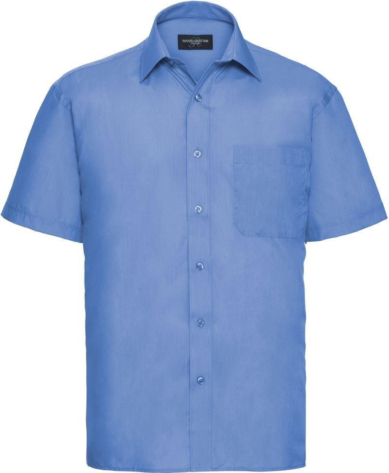 Klasszikus szabású, könnyen vasalható, kiváló minőségű, kék rövid ujjú ing kevertszálas anyagból kerekített aljjal, merevített gallérral és mellzsebbel
