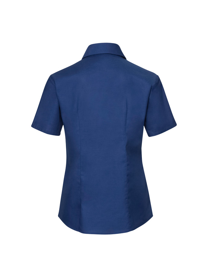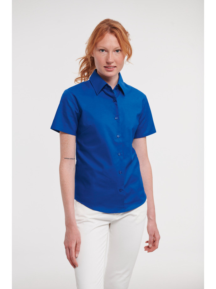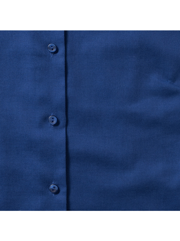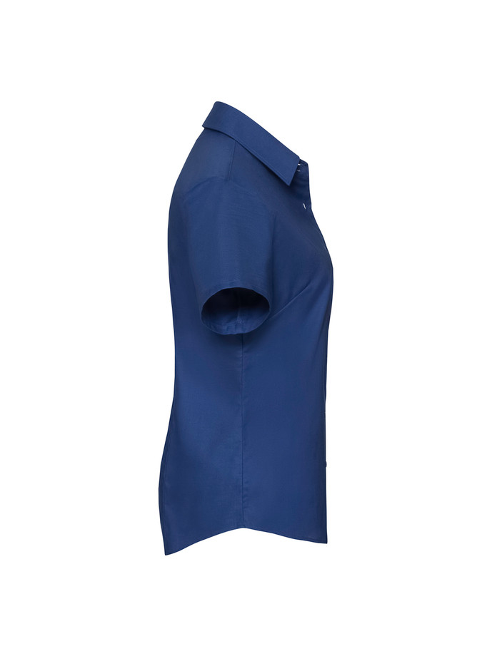 Karcsúsított szabású, kiváló minőségű kék rövid ujjú női ing kevertszálas anyagból kerekített aljjal