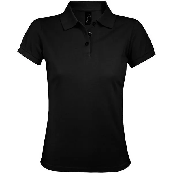 A fekete galléros női póló anyaga 35% pamutból (gyűrűsfonású) és 65% poliészterből készült, 200 g/m2 súlyú.