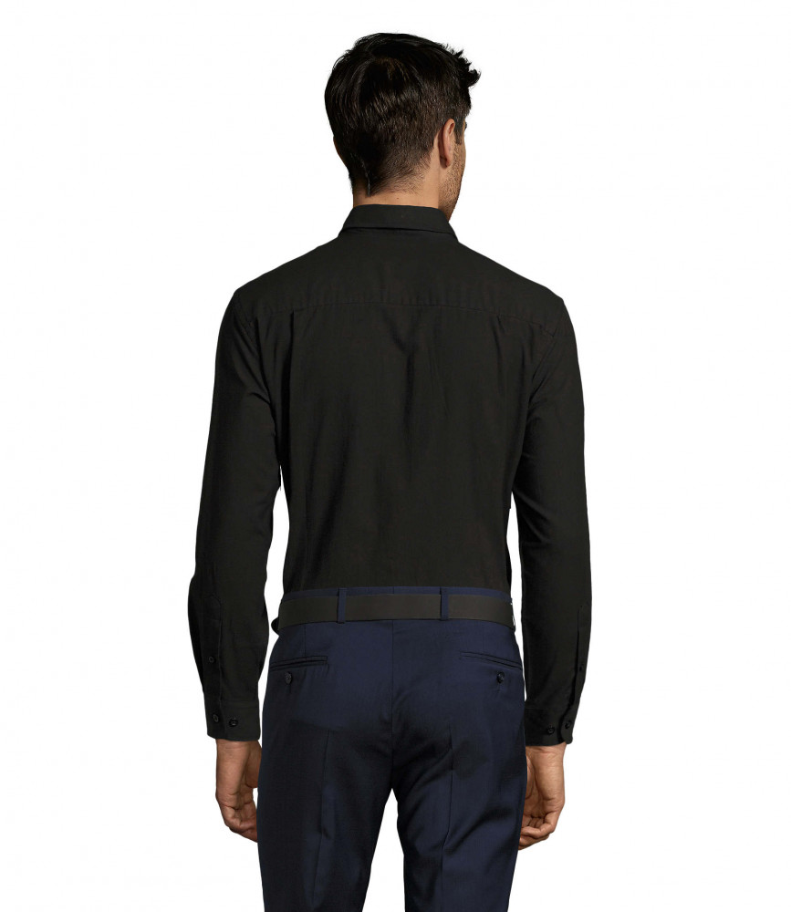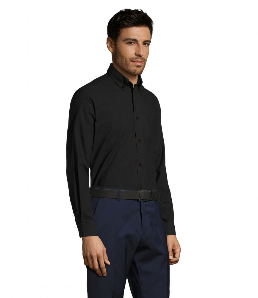 Klasszikus szabású, kiváló minőségű hosszú ujjú fekete ing mellzsebbel.