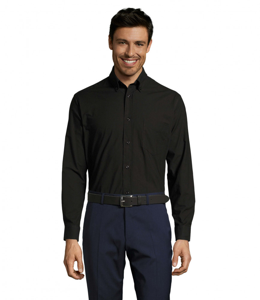 Kiváló minőségű termékünk ez a klasszikus szabású hosszú ujjú fekete ing mellzsebbel.