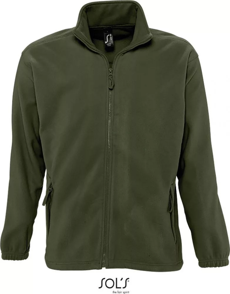 Klasszikus szabású, cipzáras khaki polár pulóver.