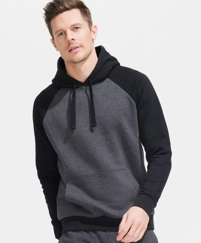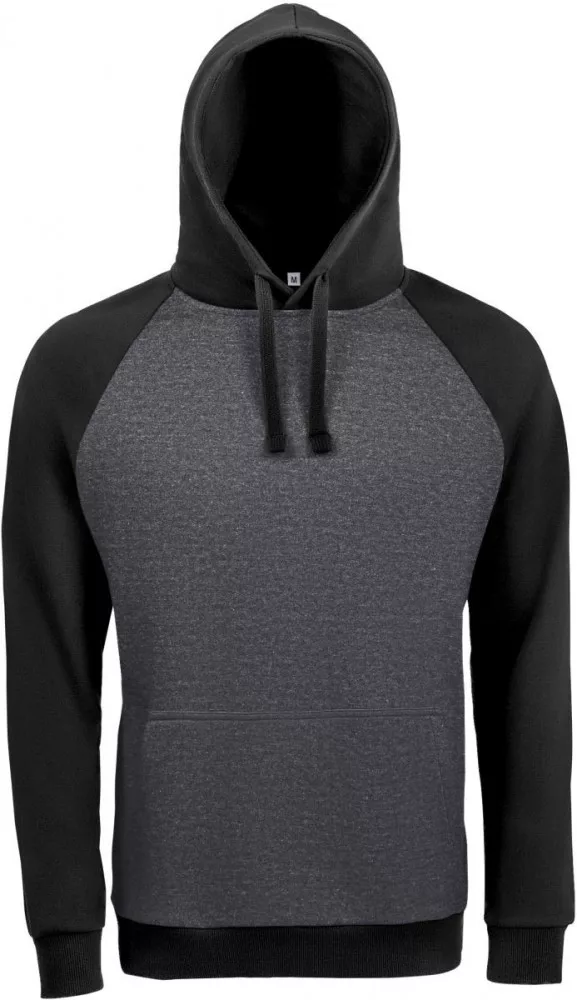 Új termékünk ez az uniszex, szürke kapucnis, kenguru zsebes pulóver, melyet kontrasztos színű húzózsinóros kapucnival és raglán ujakkal láttak el.