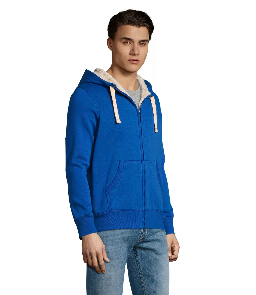 Testhezálló fazonú, kenguru zsebes, cipzáras uniszex kapucnis pulóver, sherpával melegen bélelt test- és kapucnirészzel