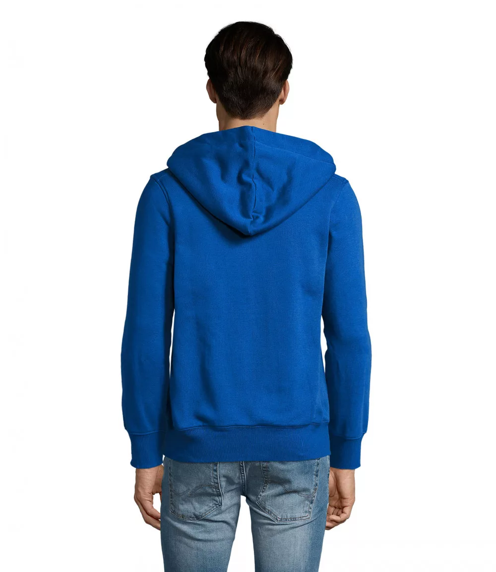 Kiváló minőségű termékünk ez az uniszex, testhezálló fazonú, kenguru zsebes, cipzáras kék kapucnis pulóver.