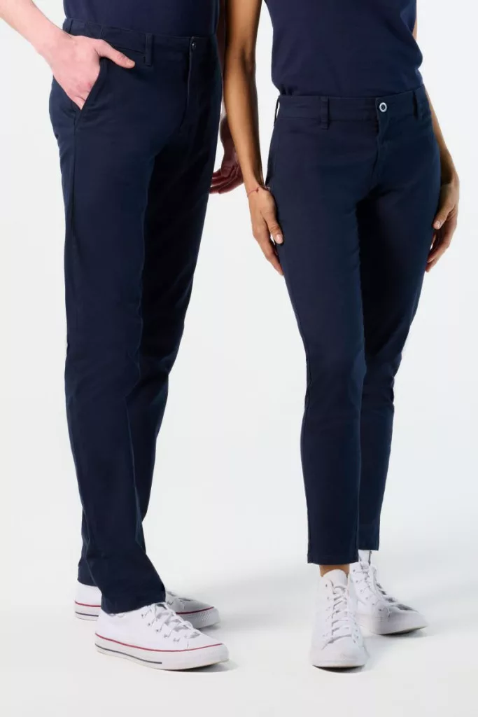 A kék nadrág anyaga 98% pamutból és 2% elasztánból készült, 240 g/m2 súlyú.