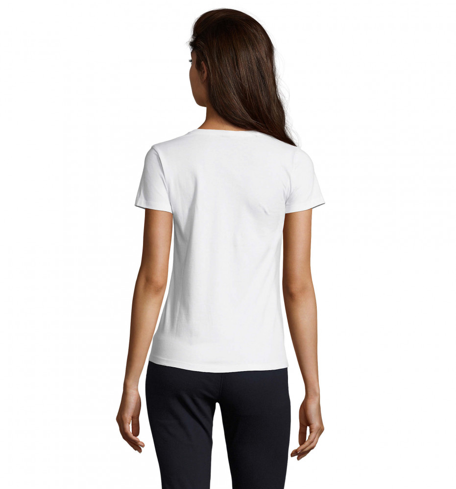 A fehér női póló anyaga 100% pamutból (félig fésült, gyűrűsfonású) készült, 190 g/m2 súlyú.