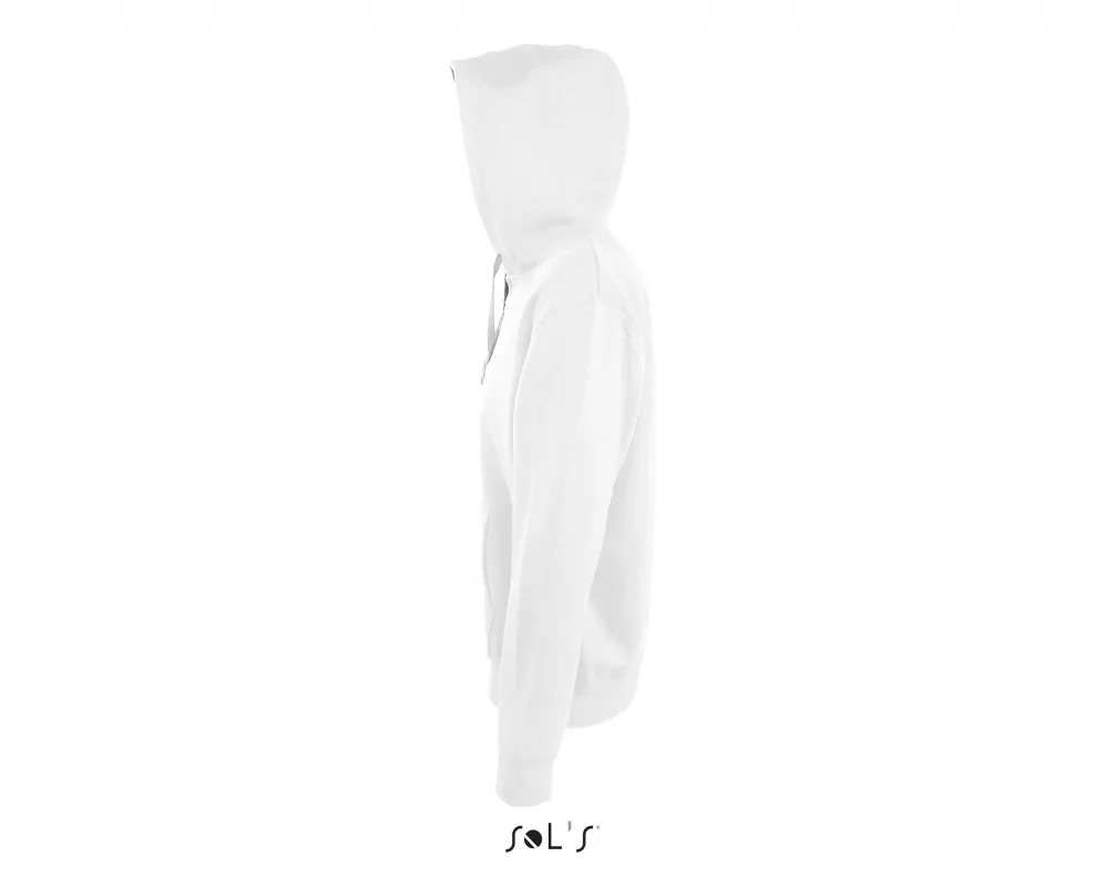 Klasszikus szabású, kiváló minőségű fehér pulóver, kapucnival és kenguru zsebekkel.