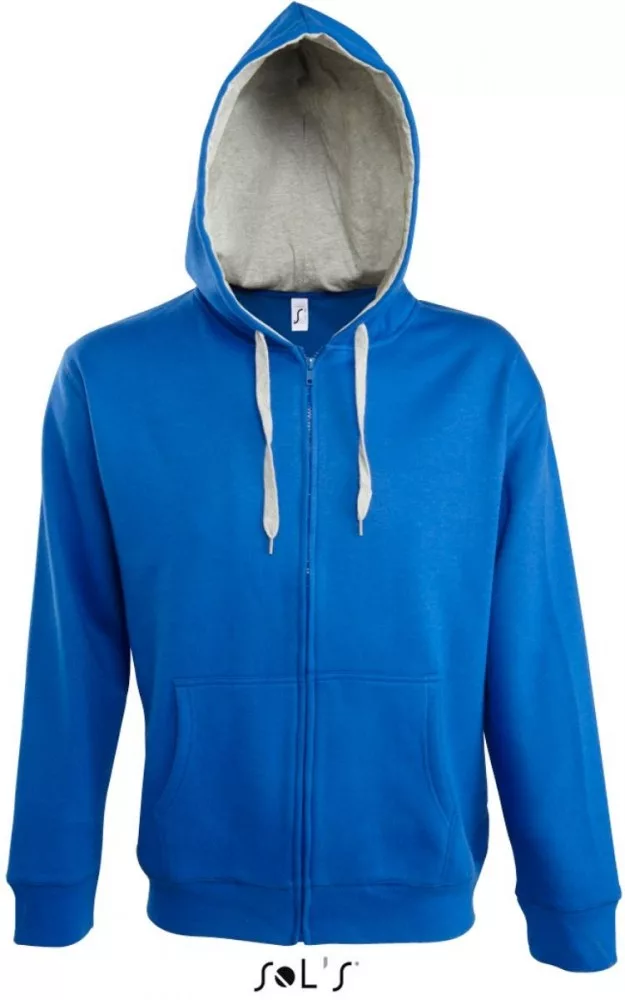 A kék pulóver anyaga 50% pamutból és 50% poliészterből készült, 280 g/m2 súlyú. Polár béléssel.