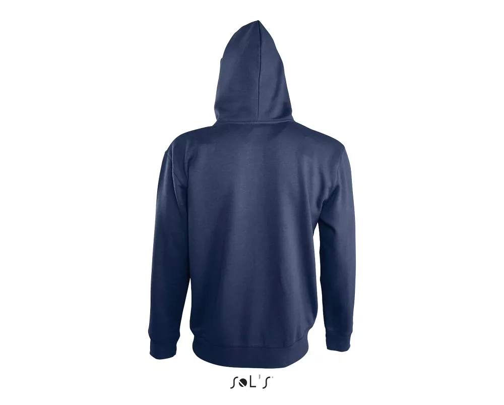 Klasszikus szabású, kiváló minőségű kék pulóver, kapucnival és kenguru zsebekkel