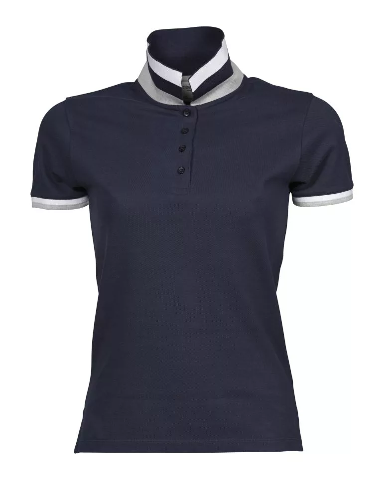 Kiváló minőségű termékünk ez a klasszikus szabású, kiváló minőségű, kék galléros női póló kontrasztos színű csíkokkal a galléron és az ujjvégeken!