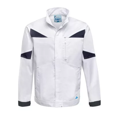 A fehér munkás dzseki szürke díszítő betétekkel van elkészítve, a dizájnosabb megjelenés érdekében.