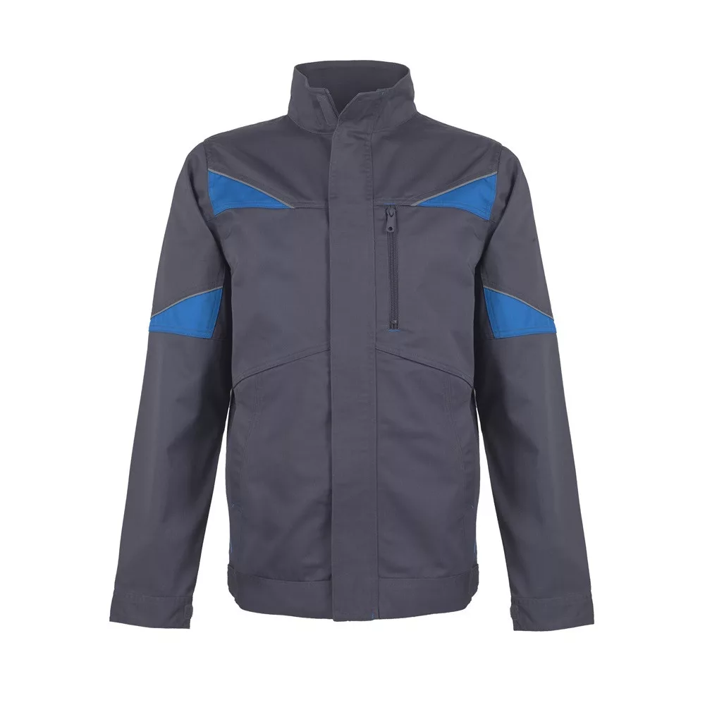 Kevertszálas anyagból készült, slim-fit szabású, kéttónusú fémmentes munkakabát, multifunkciós zsebekkel, fényvisszaverő elemekkel, állítható mandzsettával és -derékaljjal