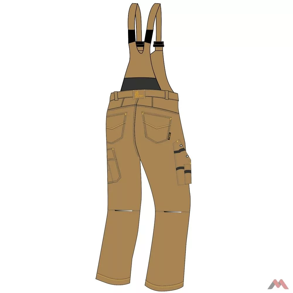 Az általános férfi alkathoz és kényelmi igényekhez igazodva a kertésznadrág a vállpánt hát-részén gumírozott. Emelt derékszabásának köszönhetően biztosan melegen tartja ezt a kritikus test tájunkat. A pántok egy-egy klasszikus, műanyag kertész csattal kapcsolódnak a mell részhez