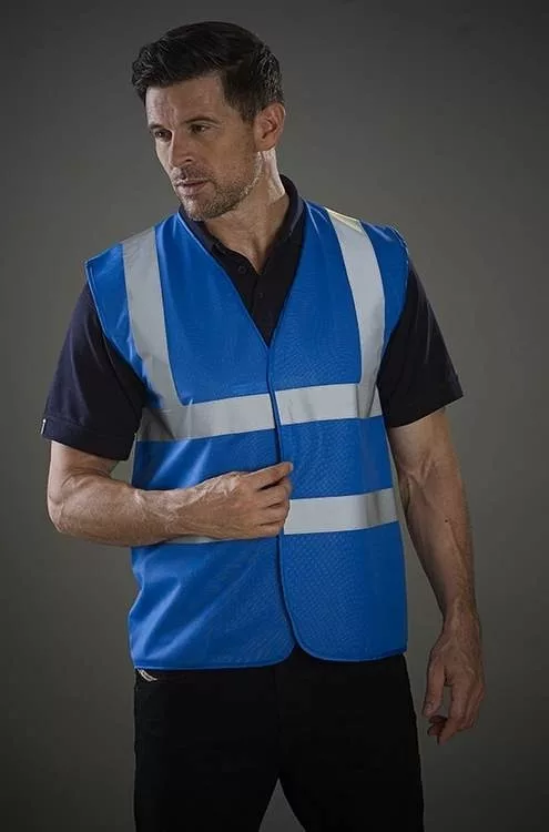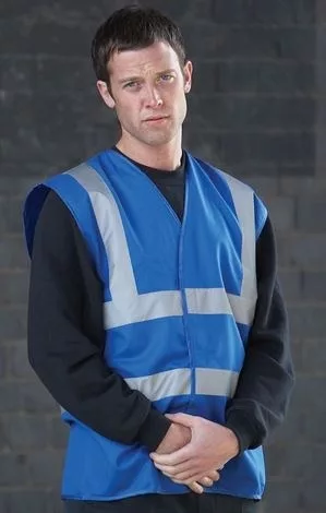 A kék jól láthatósági mellényen elhelyezett dupla fényvisszaverő csíkok sötétben jól láthatóvá teszik a viselőjét!