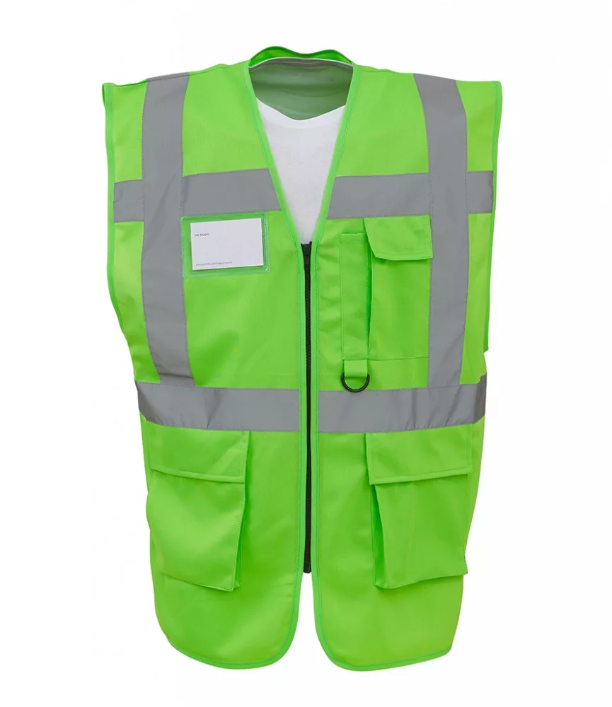 Minőségi anyagból készült, jól láthatósági mellény, cipzáros záródással, fényvisszaverő csíkokkal és többfunkciós zsebekkel